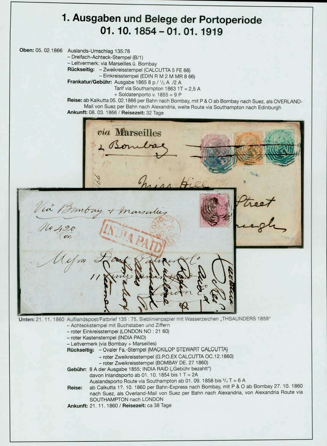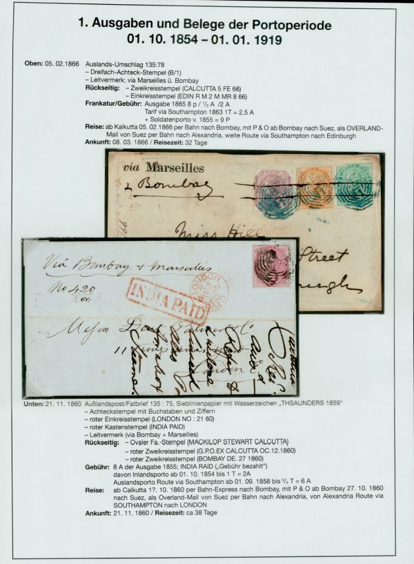 India 1866 and 1860 two covers to UK via Marseilles, one with 6a8p rate and the other with 8a rate. A fine pair
