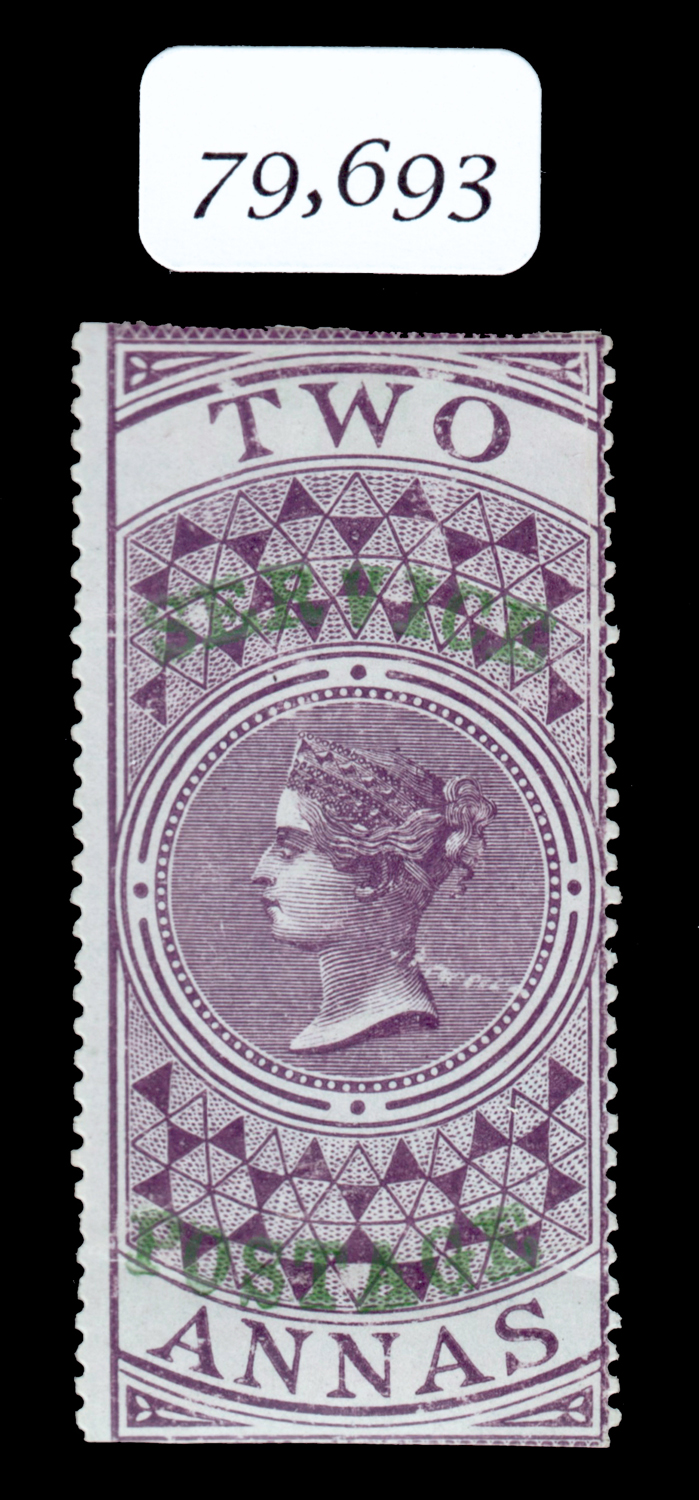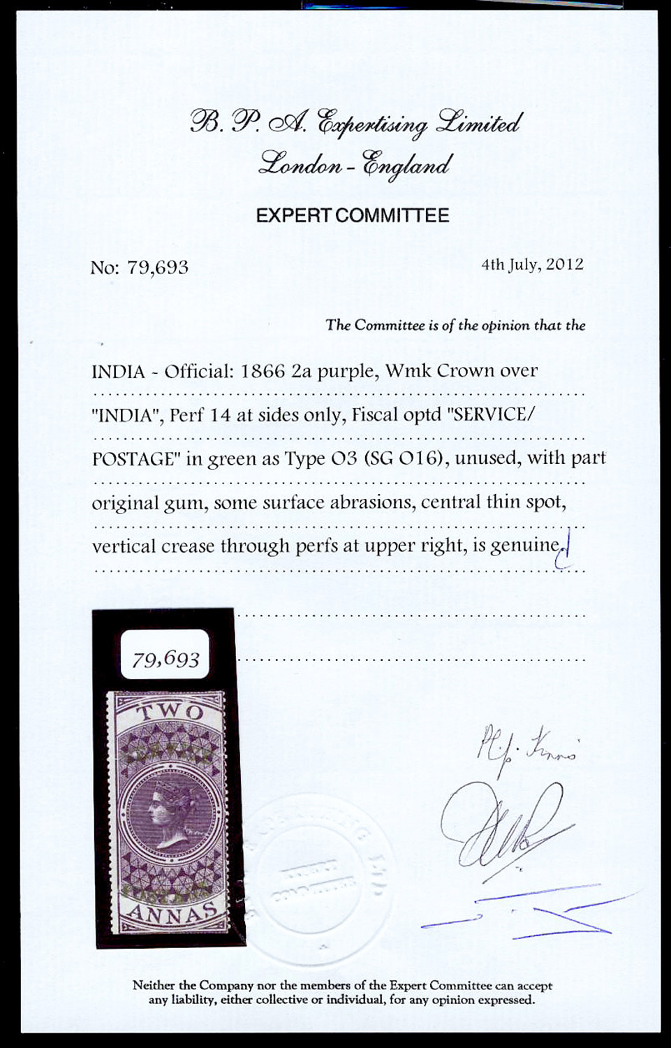 India 1866 QV 2a fiscal ovpt SERVICE POSTAGE in green as Type O3 mint, minor surface abrasions as is normal to this issue, extremely scarce as mint and undercataloged. SG O16 £3500. 2012 BPA certificate