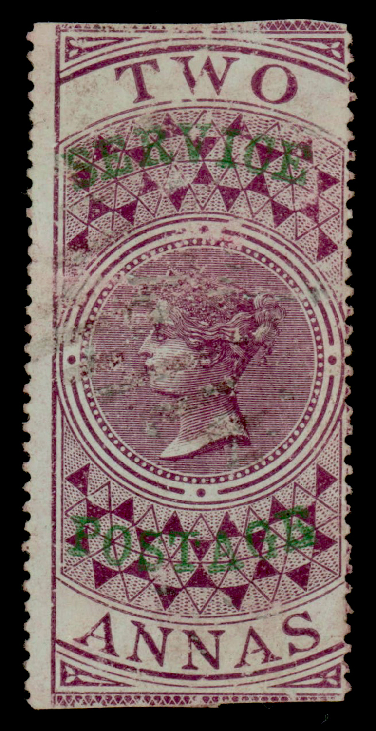 India 1866 QV 2a fiscal stamp overprinted SERVICE/POSTAGE in green as Type O3, used. SG O16 £1,400