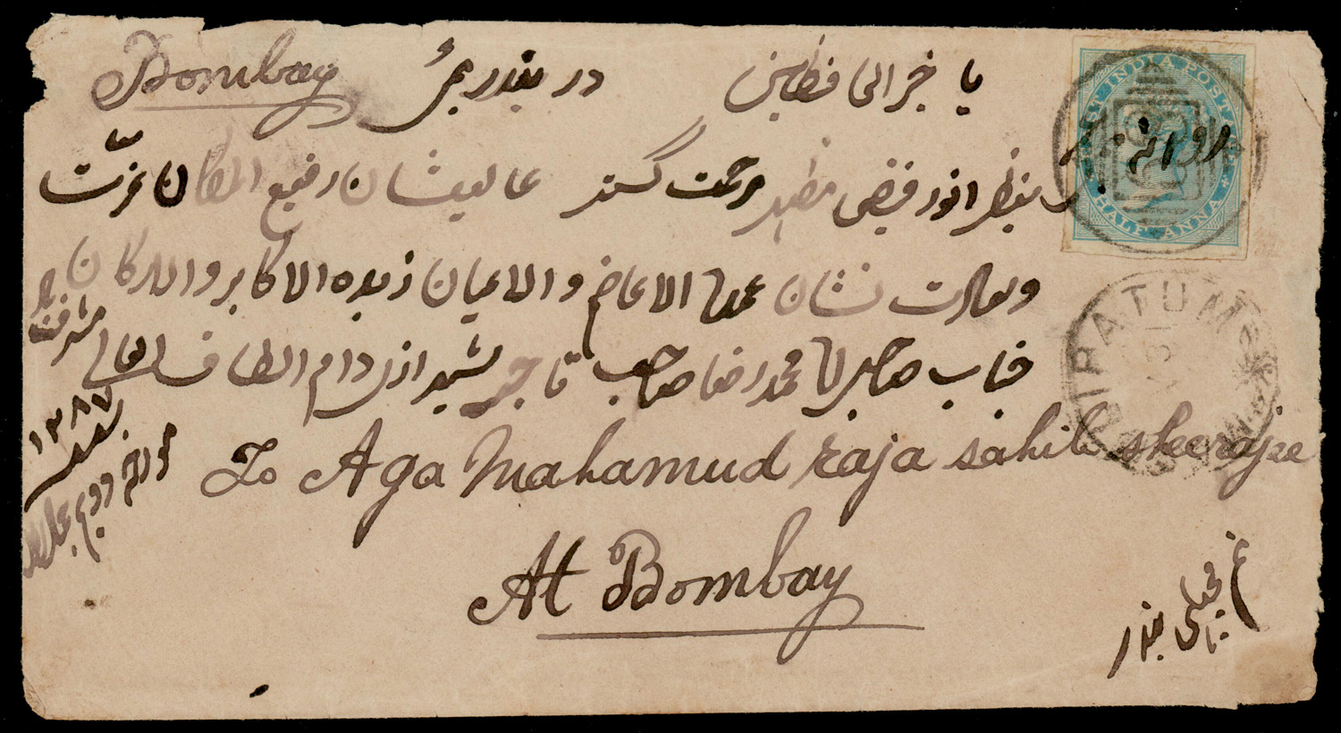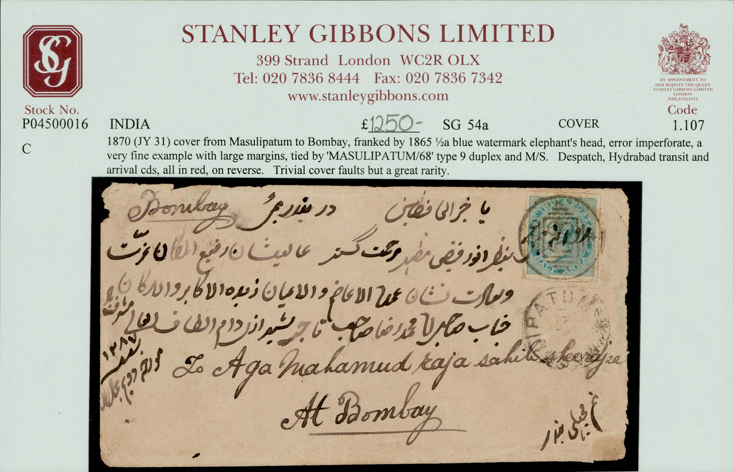 India 1870 cover from Masulipatam to Bombay, f.w. QV 1865 ½a blue, watermark elephant’s head, error: imperforate. A very fine example with large margins, tied by MASULIPATAM/68 type 9 duplex and manuscript, Hyderabad transit and arrival cds on reverse. SG 54a £6,000