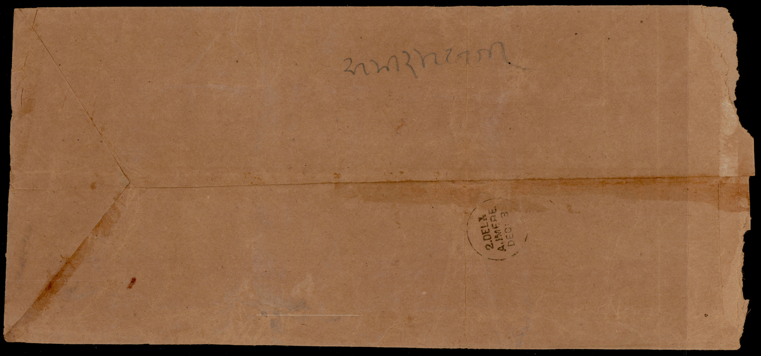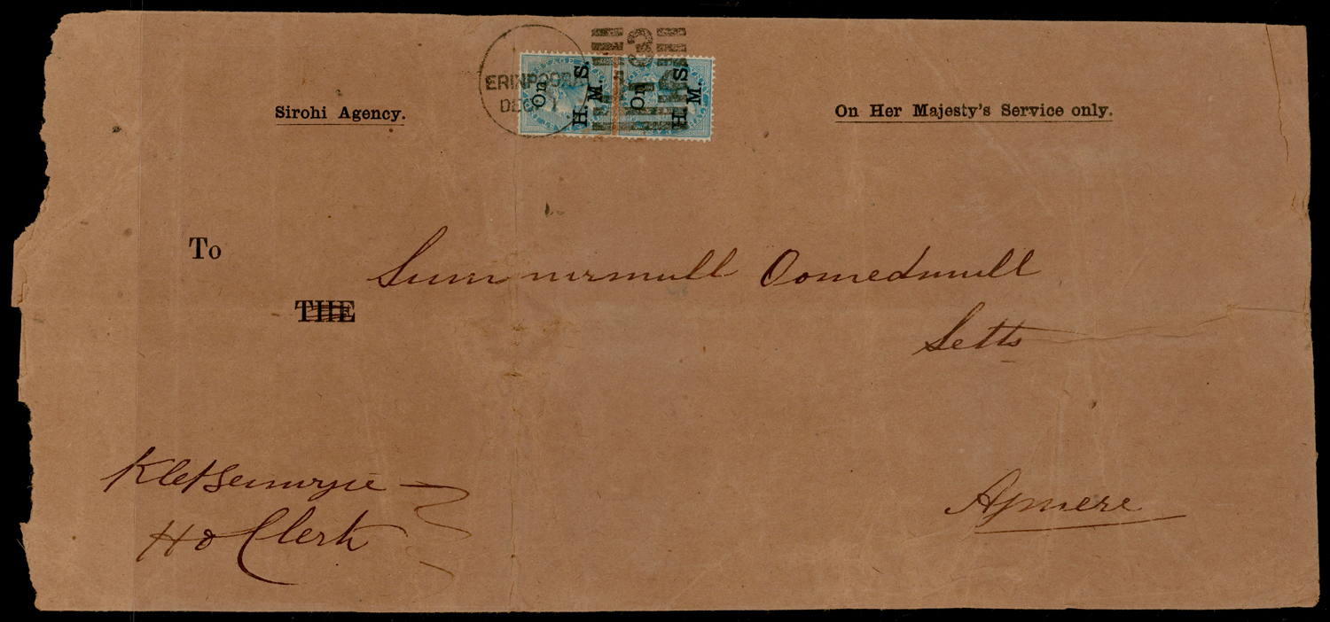 India 1882 QV ½a blue pair ovpt. On H.M.S., variety: overprint in blue-black (SG O36) on cover tied by ERINPORA/3/M-4 duplex to Ajmere with delivery cds on reverse