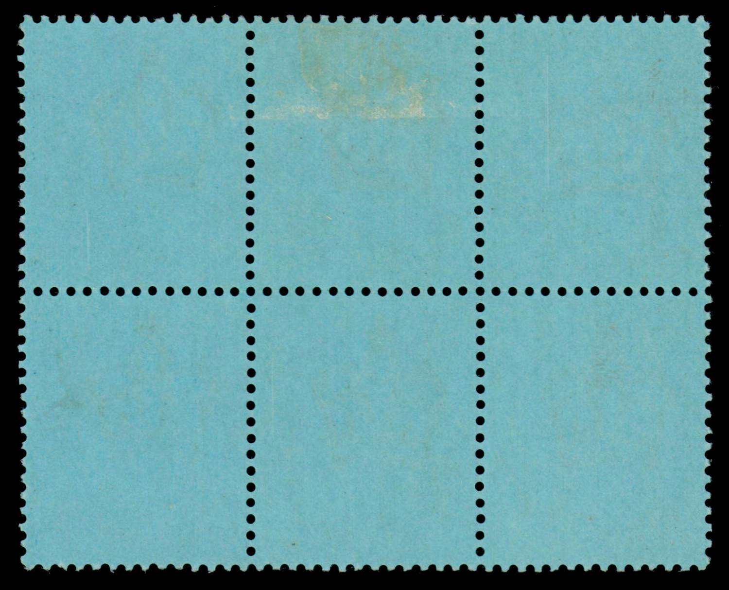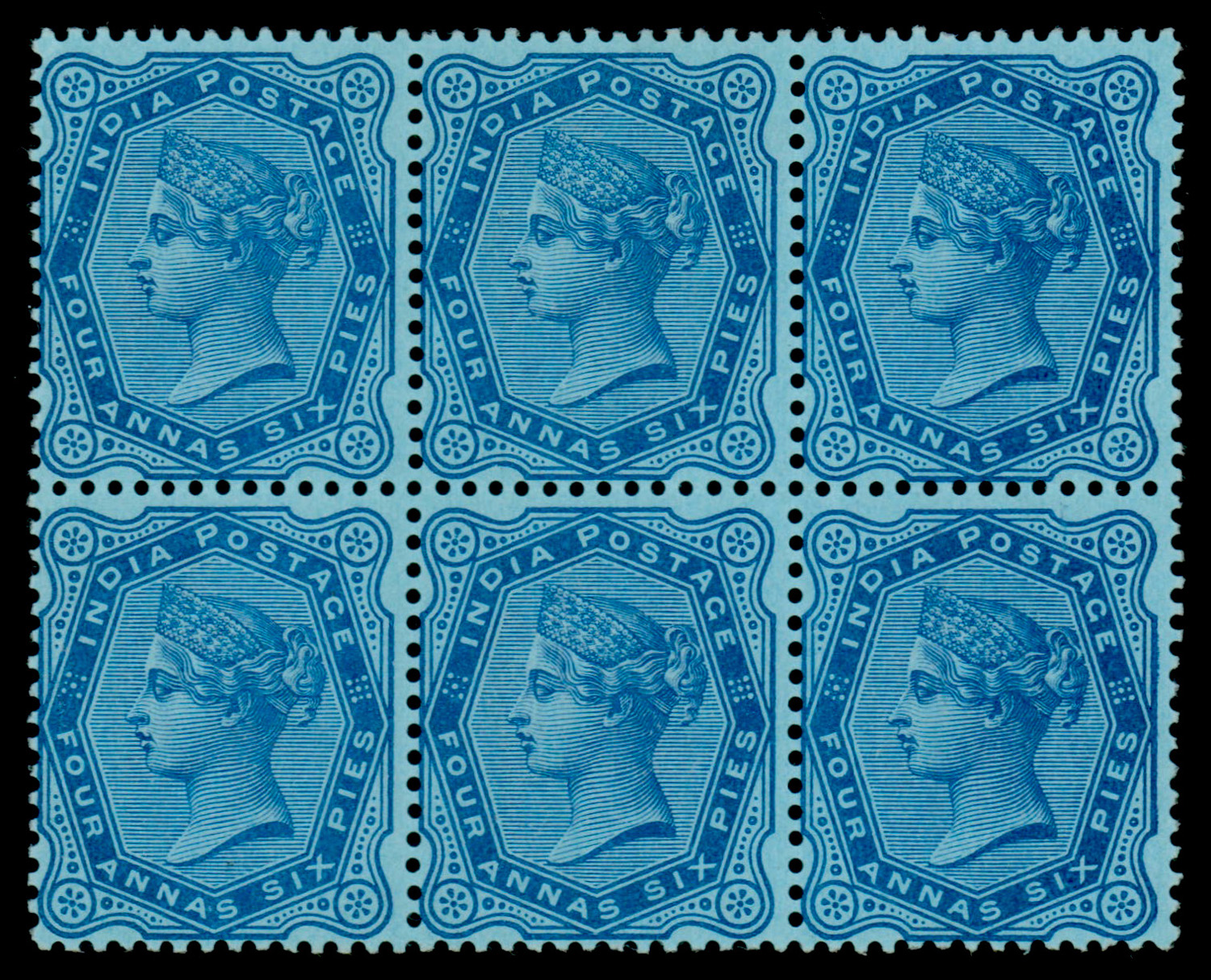 India 1886 (Nov 11) color trial for QV 4a6p in blue on blue paper, wmk Imperial Crown, block of 6, 5 stamps unmounted. Superb item believed to be unique (SG 97var) Ex Robson Lowe, 13/9/1983 lot 596