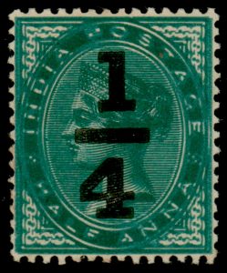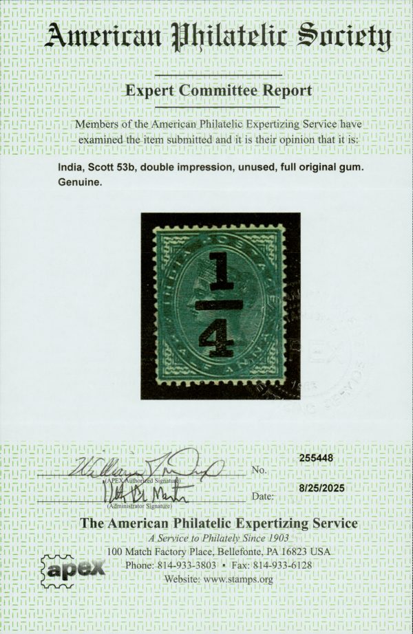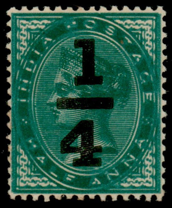 India 1898 QV “¼” on ½a blue-green, wmk star, variety: double impression of stamp, MNH. SG 110b £800+. 2025 APS certificate