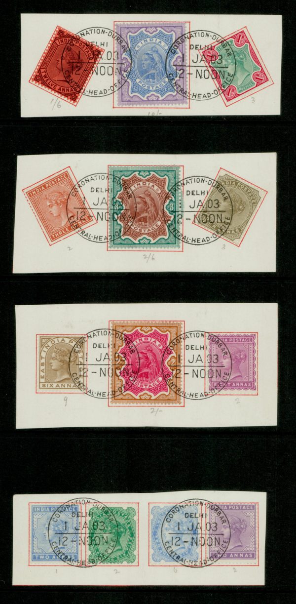 India 1903 (Jan 1) CORONATION DURBAR commemorative cancels on various QV stamps on cut down folder page