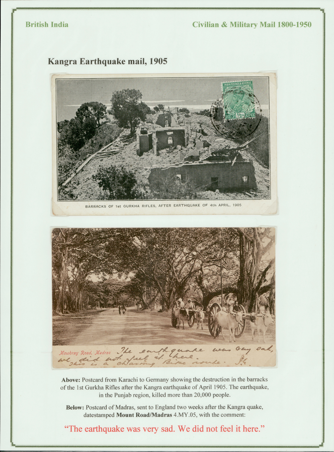 India 1905 Kangra Earthquake picture postcards, one showing the destruction and another with message “The earthquake was very sad. We did not feel it here.“
