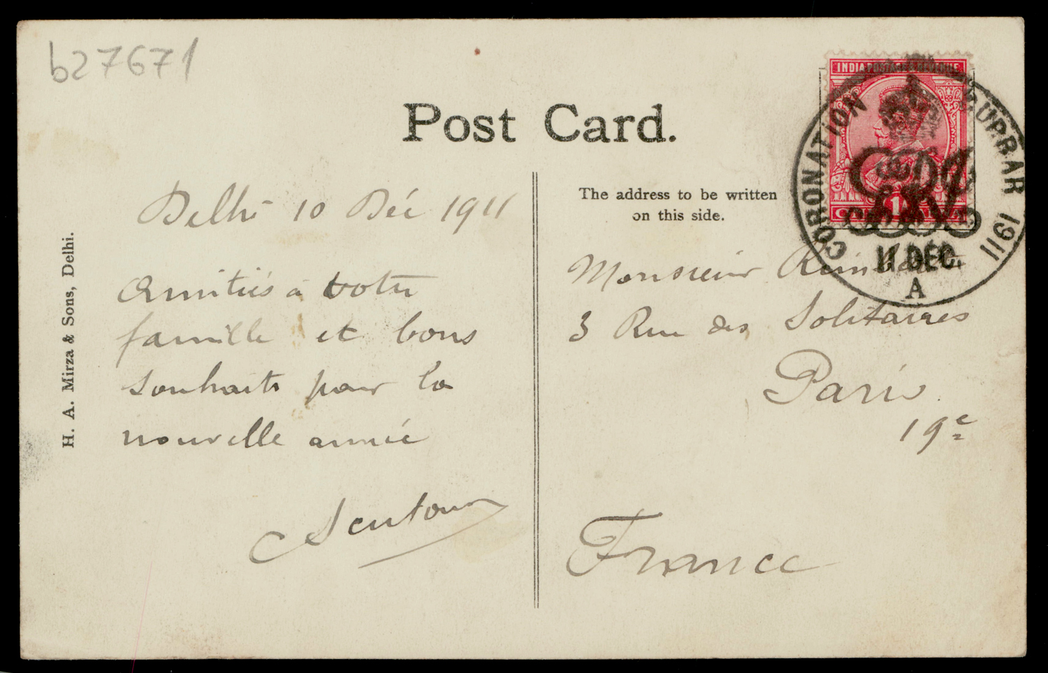 India 1911 (Dec 11) CORONATION DURBAR commemorative cancel on picture postcard to France