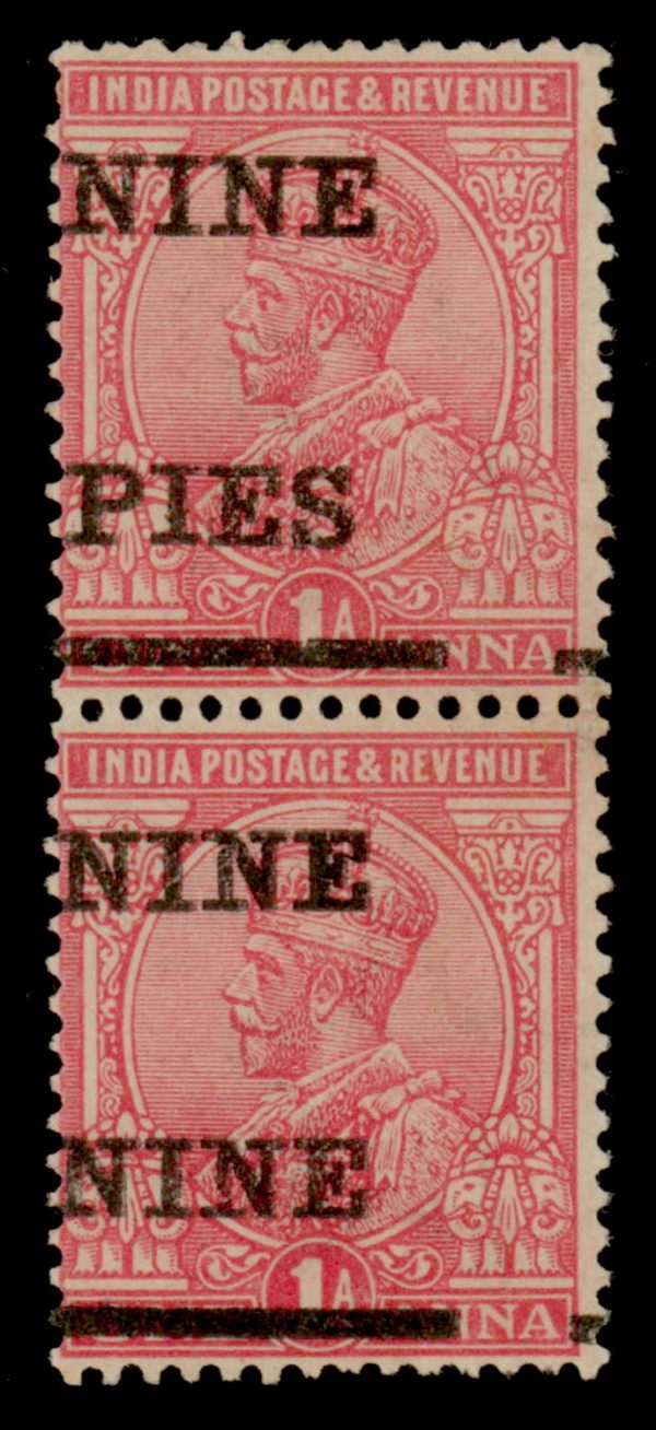 India 1921 GV NINE PIES on 1a rose-camine, vertical pair, variety: NINE NINE + overprint shifted, mint. SG 192a £150