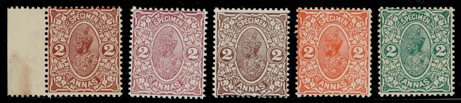 India 1925 New Delhi SPECIMEN 2a perforated stamps in 5 different shades, mint.