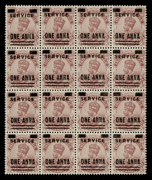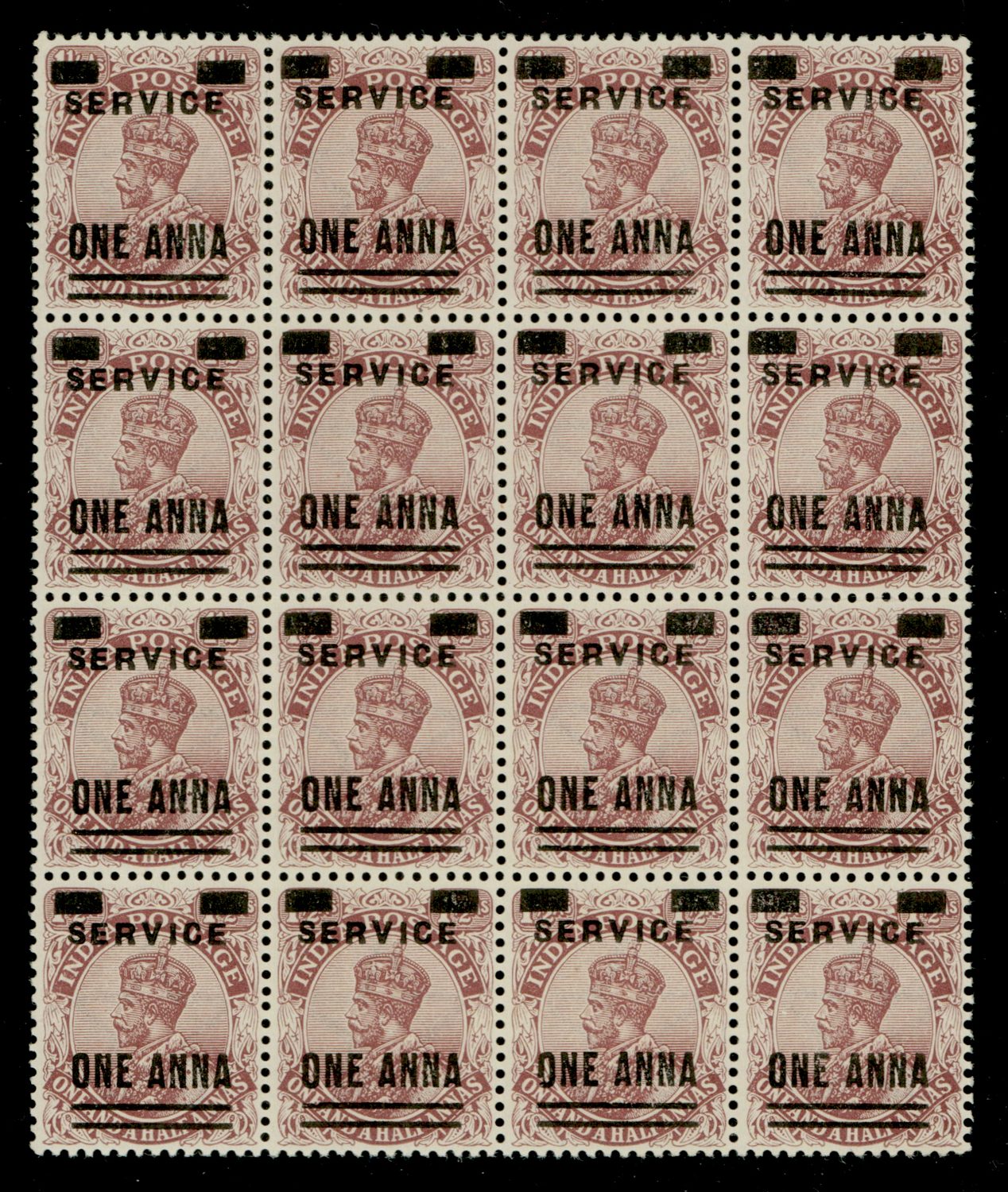 India 1926 GV 1a on 1½a chocolate, type B, blk/16, MNH except hinged on one. SG O107 £120