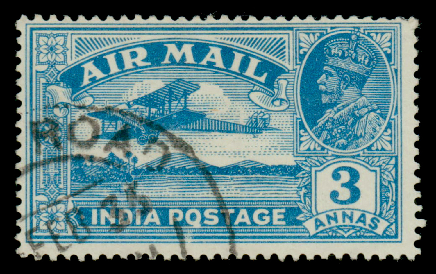 India 1929 GV 3a Airmail, variety: “Q” for “O” in POSTAGE, used. SG 221a £425