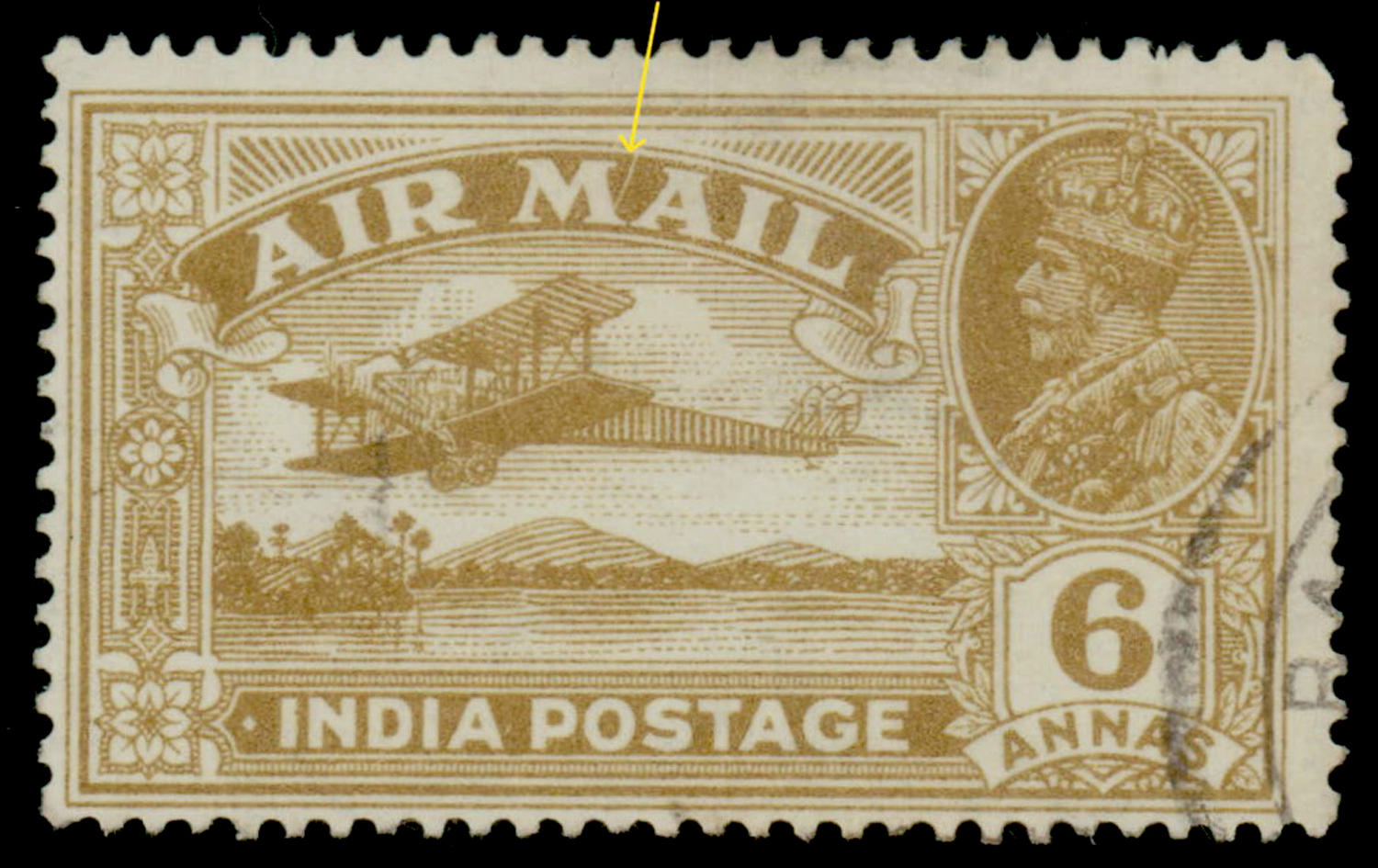 India 1929 GV 6a Airmail, variety: hairline between “M” and “A”, used. Dave type 20