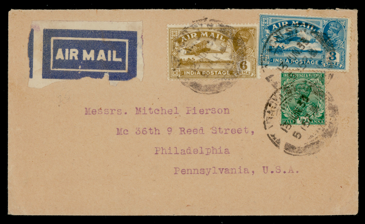 India 1929 GV 6a Airmail, variety: overinking merges frame and crown, Dave type 23, on cover from Karachi to USA, additionally f.w 3a + ½a