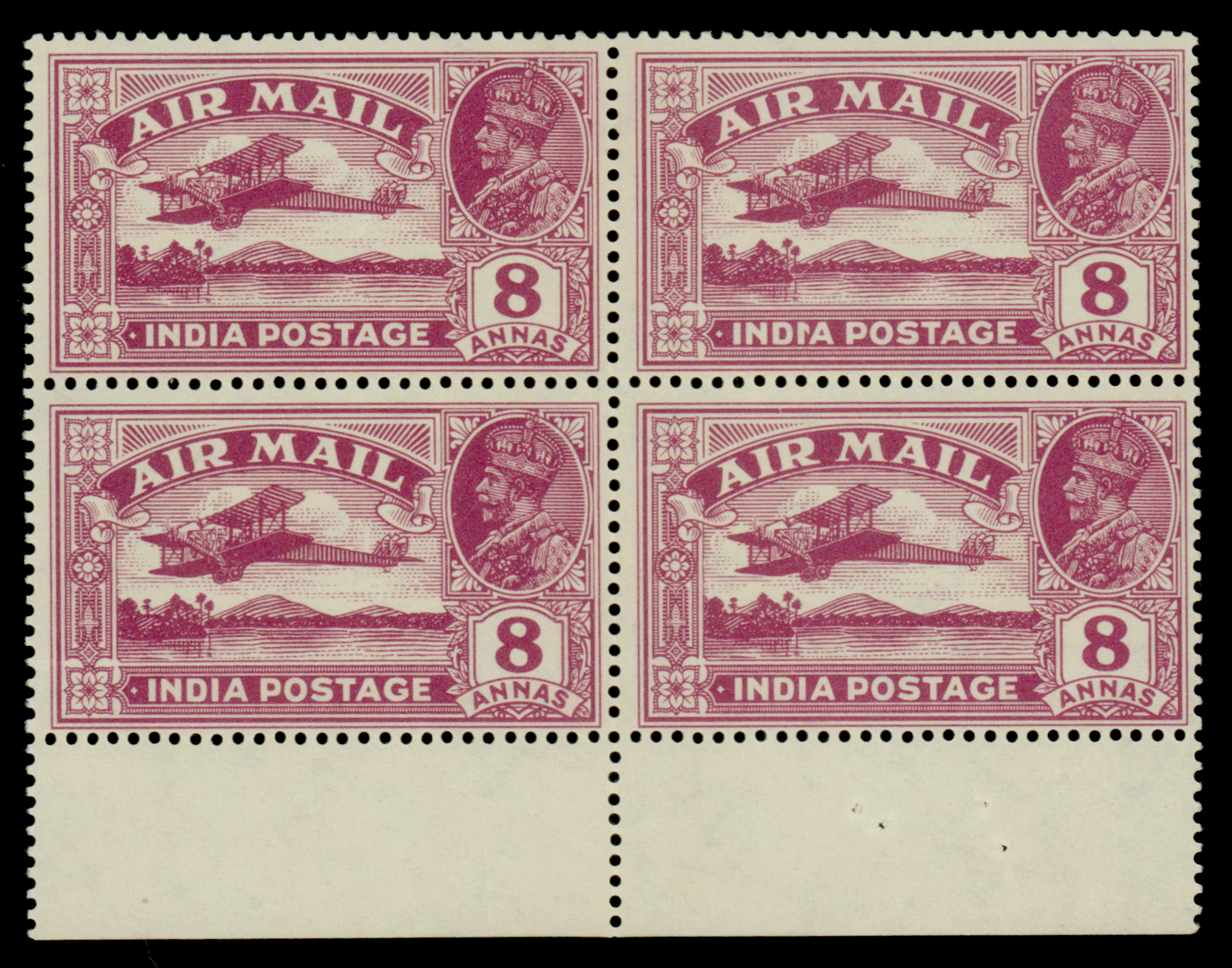 India 1929 GV 8a Airmail, bottom marginal blk/4, variety: reversed serif, mint. SG 224b £980++