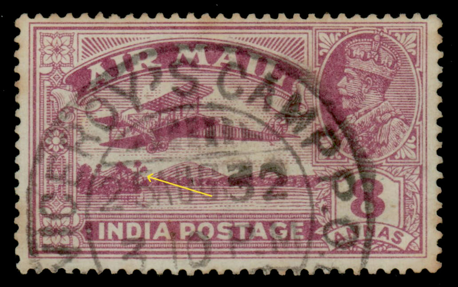 India 1929 GV Airmail 8a, variety: broken lower trunk, used. Dave type 22