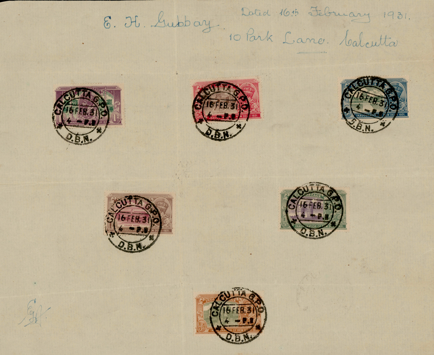 India 1931 GV Inauguration complete set on sheet, with “CALCUTTA G.P.O./16 FEB.31/D.B.N” cancels. SG 226/231 £50++