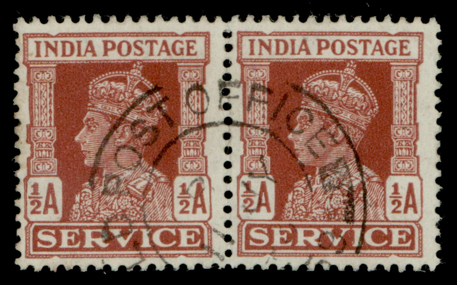 India 1939-42 GVI ½a red-brown Official, horizontal pair, variety: watermark inverted, fine used with “(FIE)LD POST OFFICE” cds. SG O141w £180