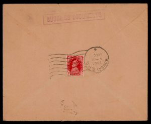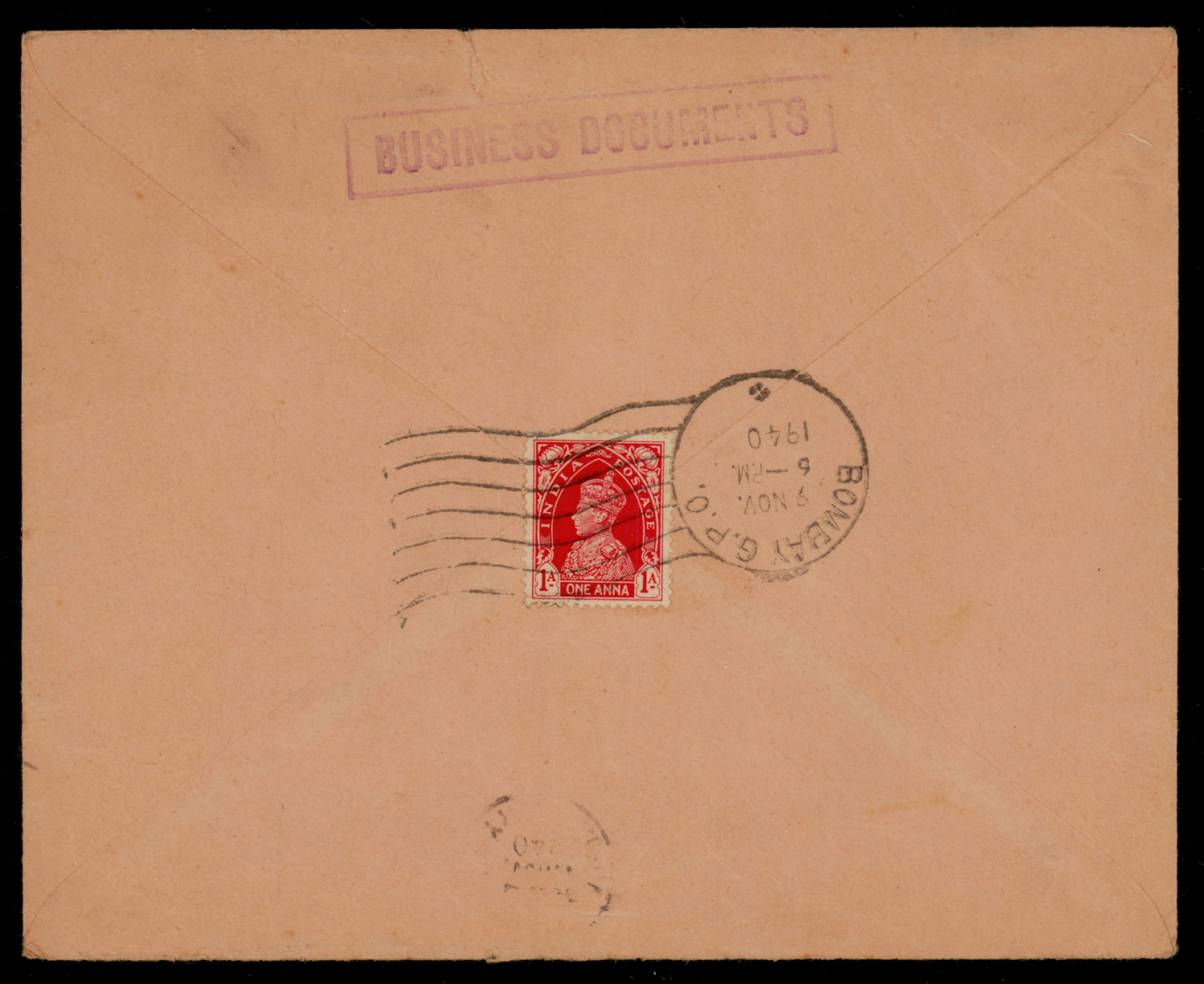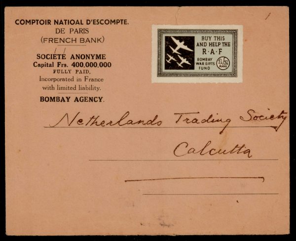 India 1940 GVI advertizing cover from Bombay to Calcutta with BUY THIS AND HELP R.A.F. BOMBAY WAR GIFTS FUND ½a label