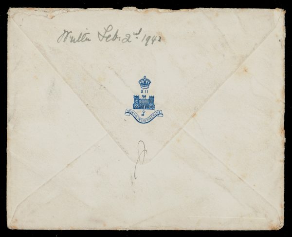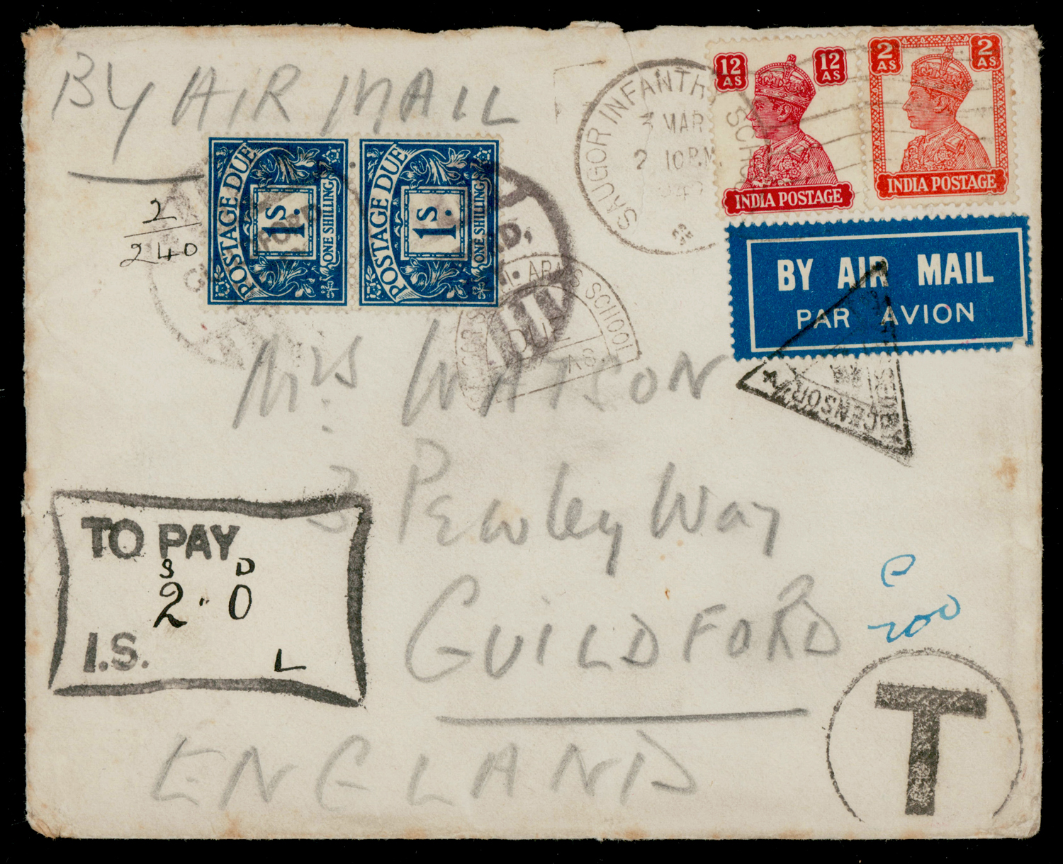India 1942 Censor Airmail cover from Saugor Infantry School, with POSTAGE DUE mark, to GB with 1s Postage Due pair, tied by Guildford and TO PAY
