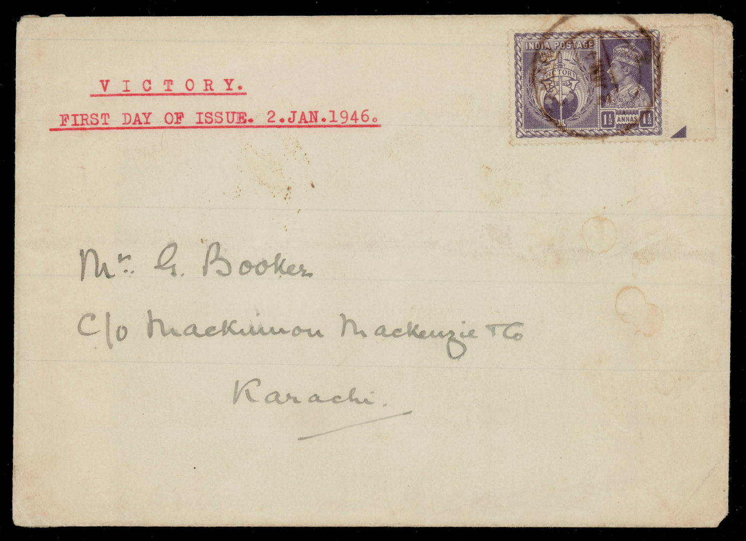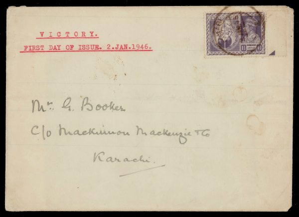 India 1946 (Jan 2) GVI Victory 1½a on First Day Cover from Amara to Karachi with delivery cds on reverse
