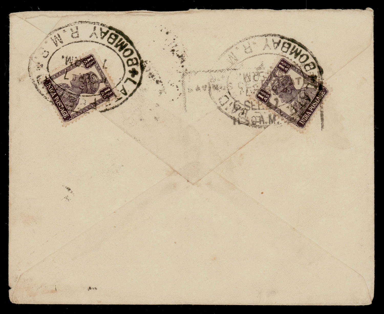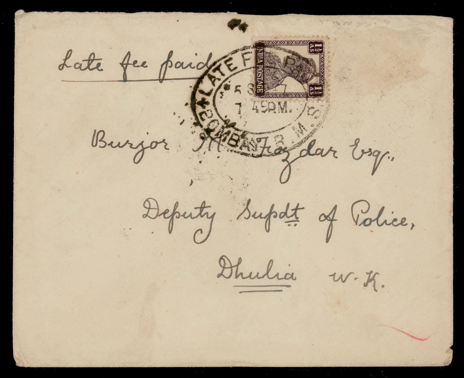 India 1947 LATE FEE PAID/BOMBAY R.M.S. used as dispatch cancelor on cover to Dhulia