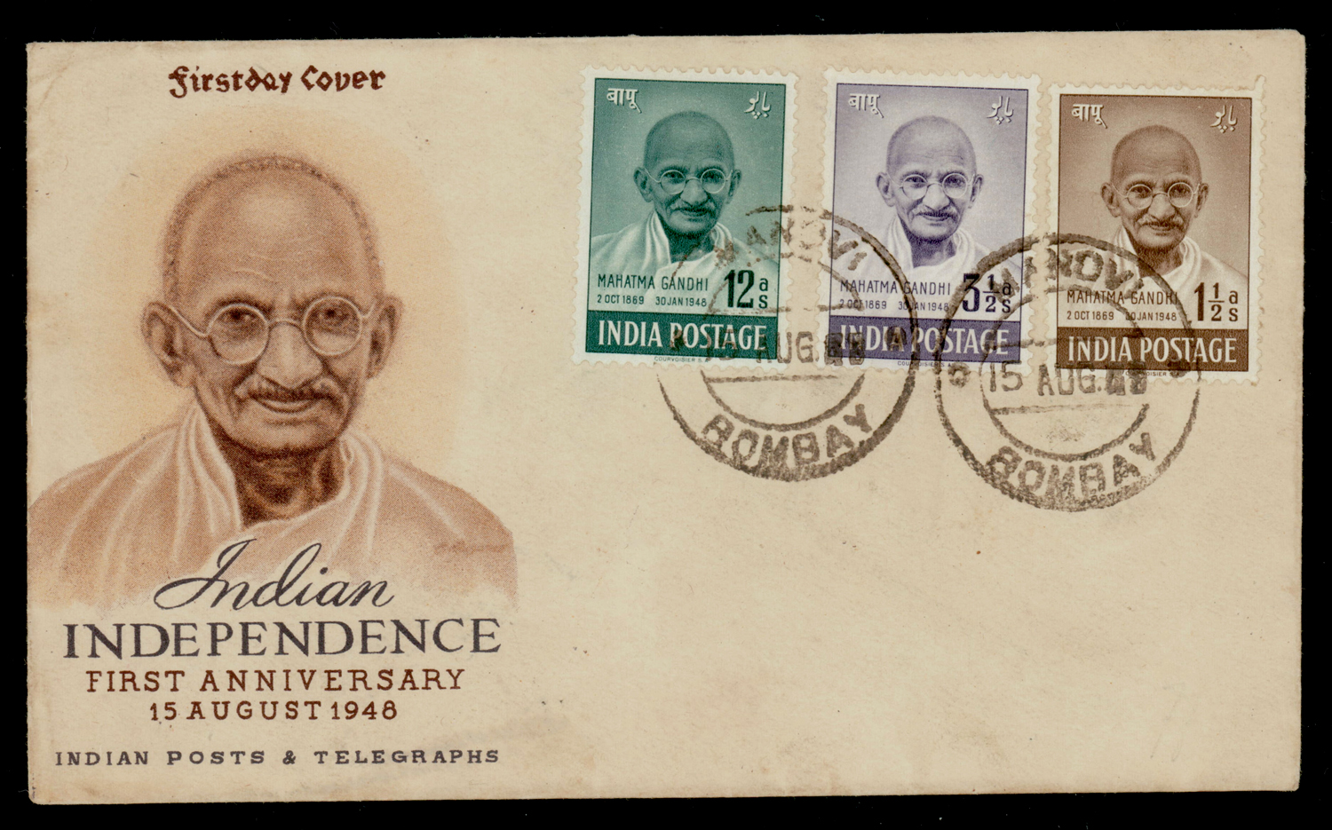 India 1948 (Aug 15) Gandhi 1½a-12a on unaddressed Official FDC from Mandvi Bombay. SG 305/307