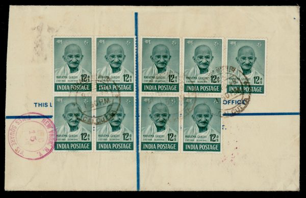 India 1948 Gandhi 12a blk/4 x 2 + single on GV registered stationery to USA, with U.S. CUSTOMS/PASSED FREE oval of New York. SG 307