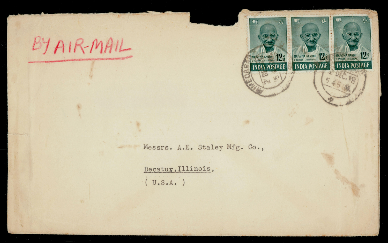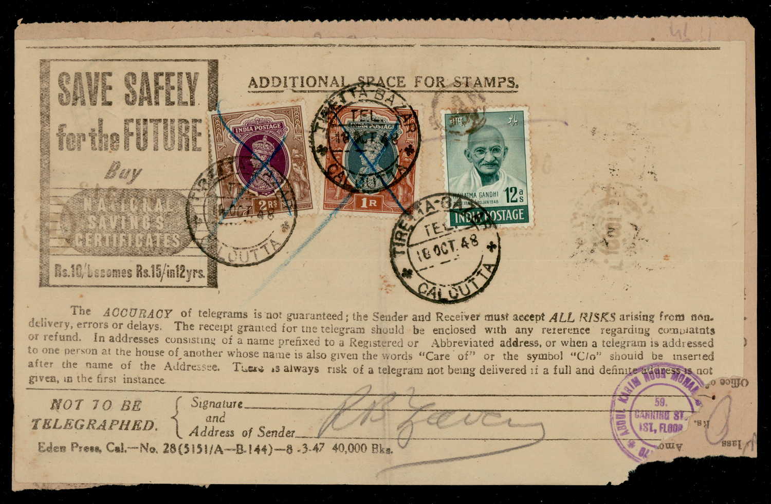 India 1948 Gandhi 12a + GVI 2r + 1r on telegram form used from Calcutta, another cover f.w. strip/3 from Ahmedabad to USA (2)
