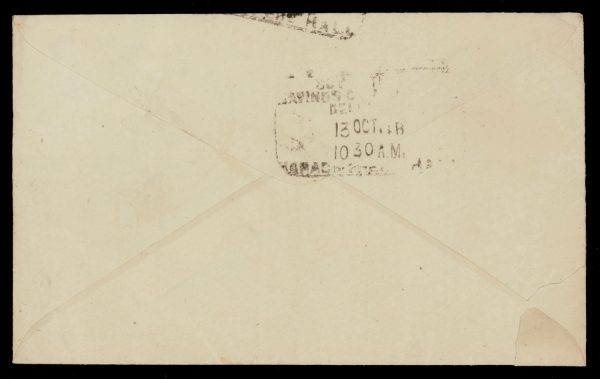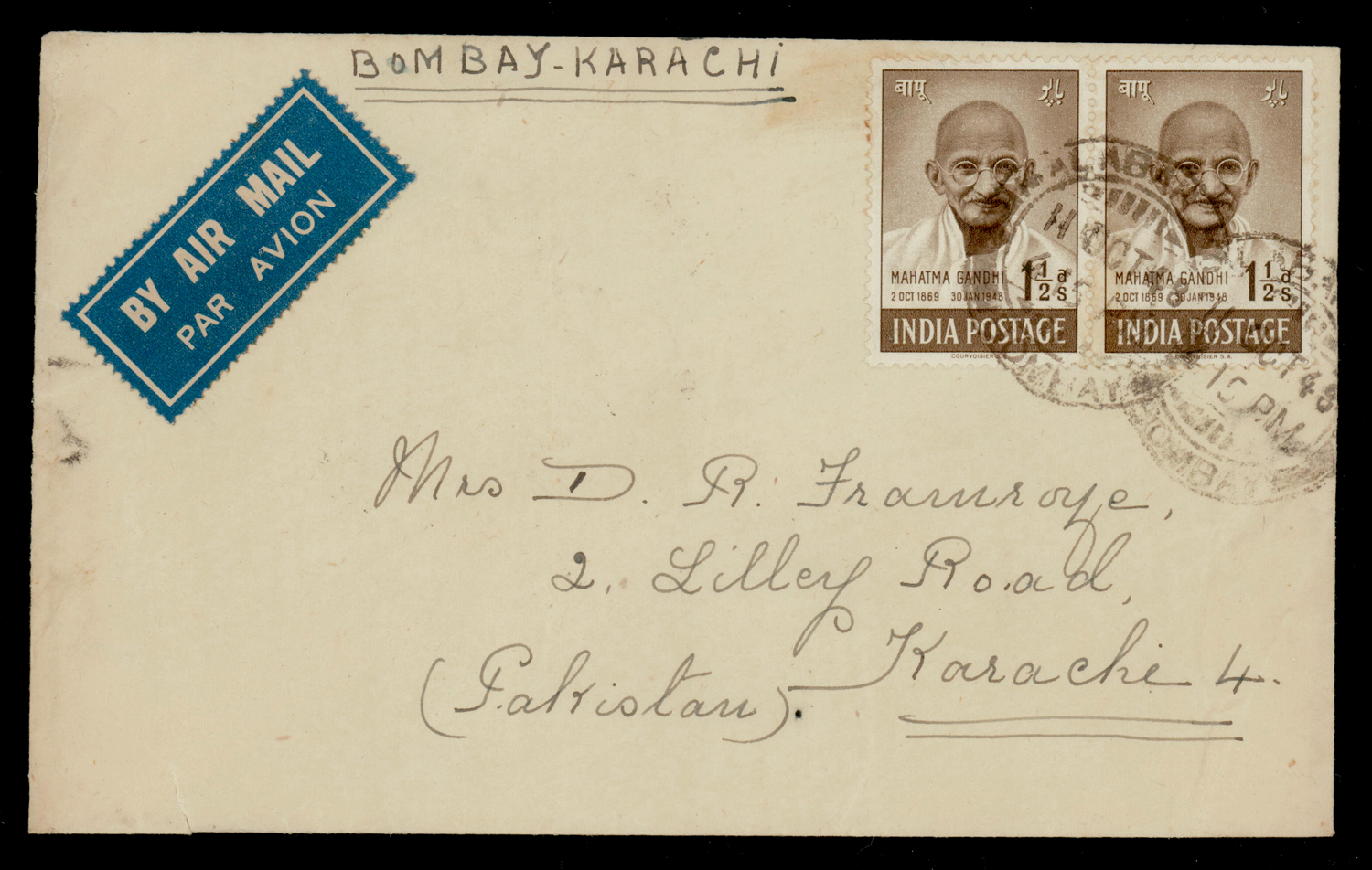 India 1948 Gandhi 1½a pair used on airmail commercial cover from Bombay to Pakistan, with slogan delivery on reverse. SG 305