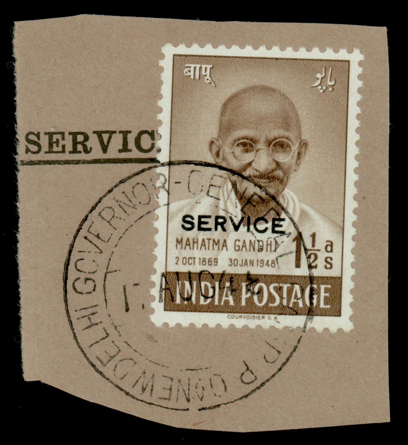 India 1948 Gandhi 1½a SERVICE, used on piece with GOVERNOR GENERAL CAMP P.O. NEW DELHI cds, SG O150a £120