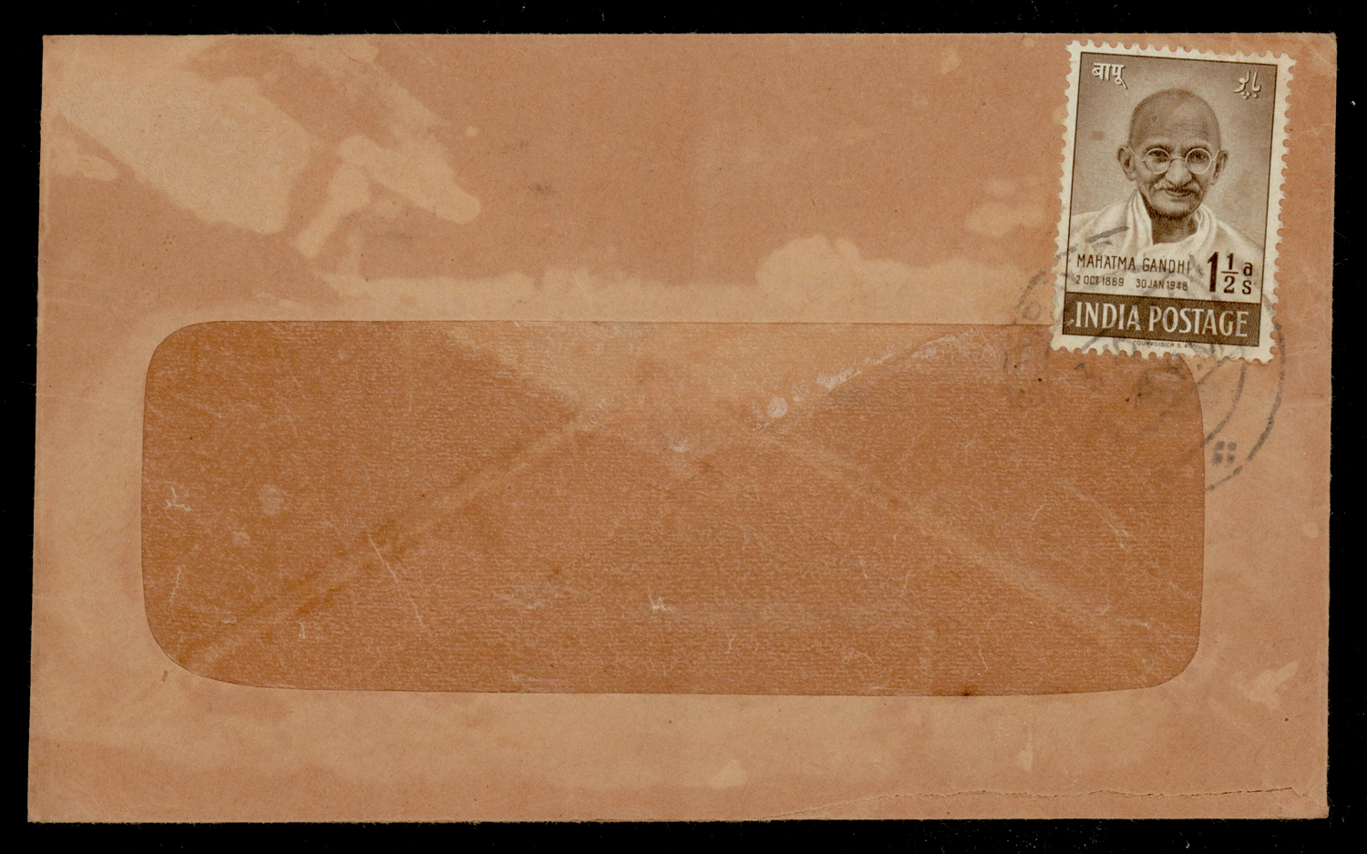 India 1948 Gandhi 1½a used on window envelope from Bombay to Delhi. SG 305