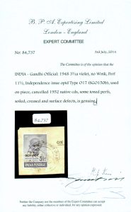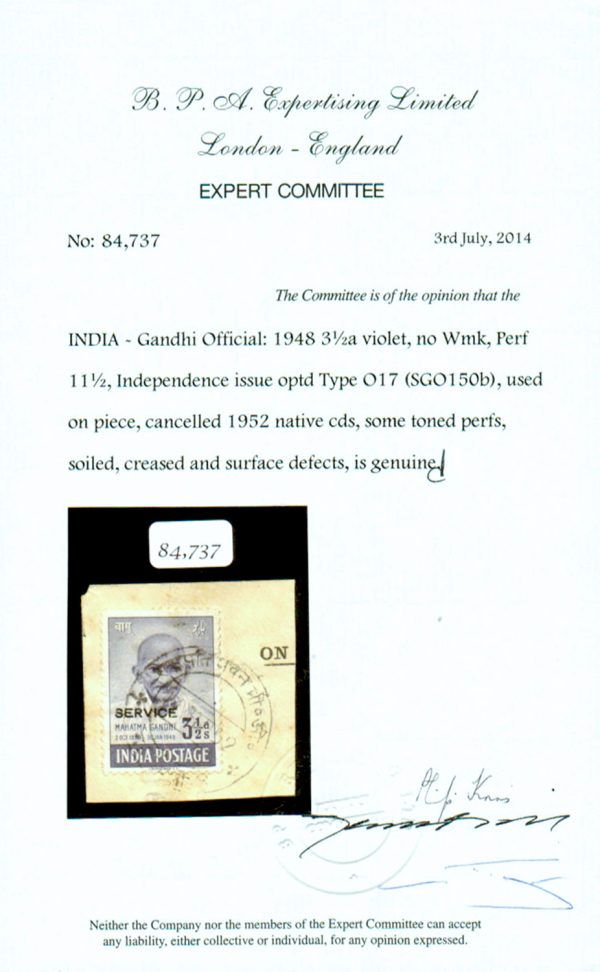 India 1948 Gandhi 3½a overprinted SERVICE used on piece, cancelled “RASHTRAPATI BHAVAN P.O. / NAI DILLI 4 / 14 OCT 52” (native hindi cancel) cds. The Gandhi Service stamps were intended for use by the Governor’s Office, New Delhi. Lord Mountbatten, the then Governor General, handed over this post to Rajagopalachari who served as Governor-General of India from June 1948 until 26 January 1950. This stamp was used from the President’s office in 1952 which is extremely rare – possibly the only known Gandhi Official stamp to be used from this office – a great modern India rarity, especially for Gandhi collectors. SG O150b £3,000+ – 2014 BPA certificate