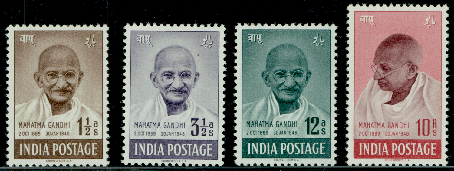 India 1948 Gandhi complete set to 10r, purple-brown and lake, fine MNH. SG 305/308 £425