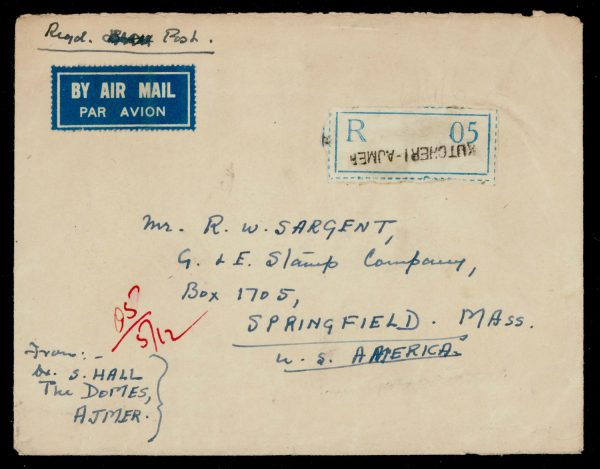 India 1952 cover franked with GVI 5r + others on registered airmail cover from Kutucheri-Ajmer to USA, with delivery cds