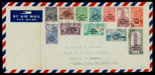 India 1954 Airmail cover bearing complete set of 12, 3p to 1r, Military stamps ovpt. “Korea” tied by “F.P.O No. 740” to Delhi with delivery cds on reverse. SG K1/K12 £100 as used, much more on cover