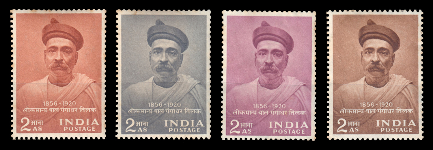 India 1954 Tilak 2as Color trials x 3 along with issued stamp, toned gum, scarce. SG 374 CT