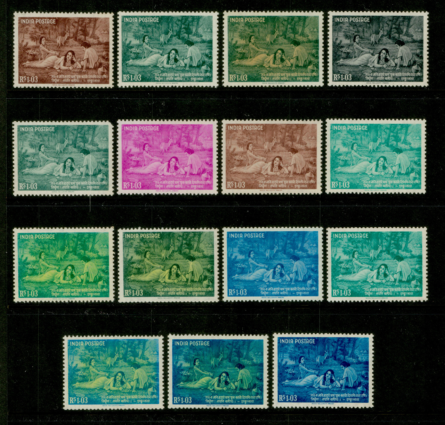 India 1960 1r03nP Kalidasa Poet Shakuntala, 15 different perforated color trials on Ashoka sideways watermark paper, MNH. SG 428 CT