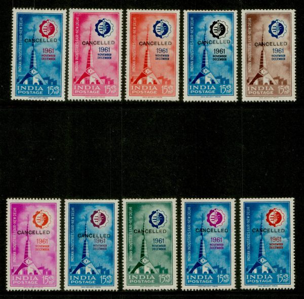India 1961 15nP Emblem, Exhibition gate 10 different perforated color trials on Ashoka upright watermark paper, each overprinted CANCELLED, MNH. SG 444