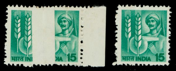 India 1979 15p definitive, right marginal, variety: pre-print paper fold, with normal for comparision, MNH. SG 923var