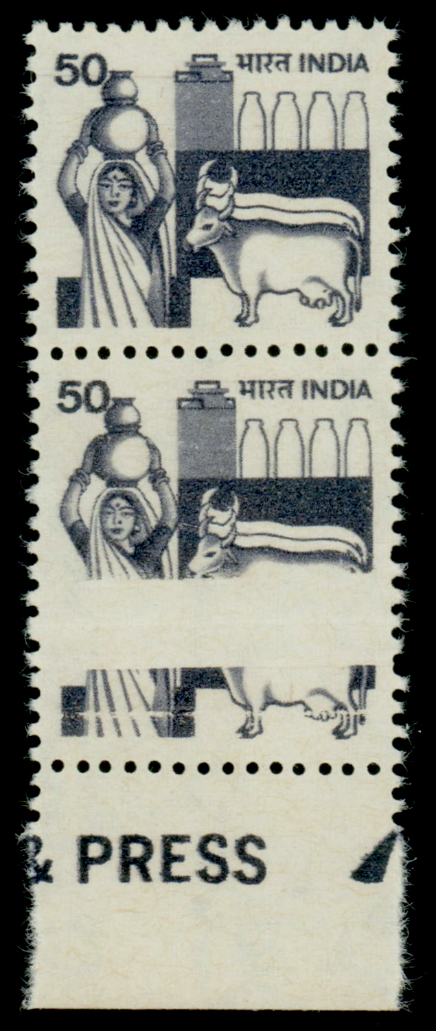 India 1979 50p Dairy bottom marginal vertical pair, variety: pre-print paper fold, MNH. SG 928