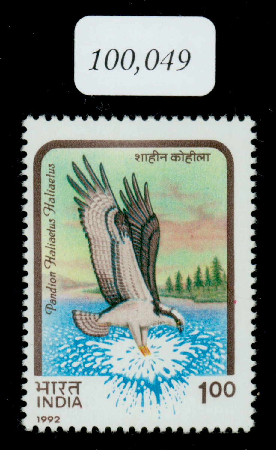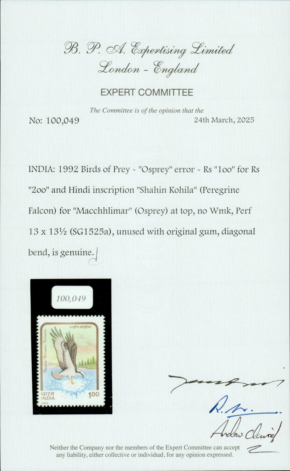 India 1992 Birds of Prey “Osprey” error, Rs “1” for Rs “2” and hindi inscription “Shahin Kohila” (Peregrine Falcon) for “Macchhlimaar” (Osprey) at top, MNH. SG 1525a £3,500