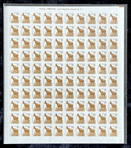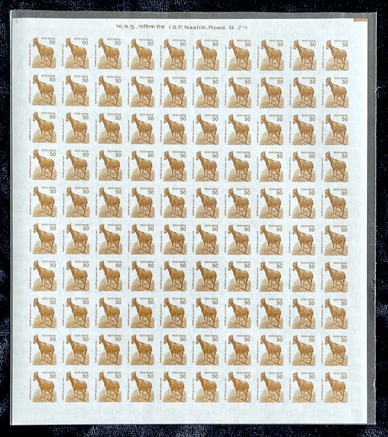 India 2000-2002 Wildlife Nilgiri Tahr 50p complete sheet/100, variety: imperforate, MNH. SG 1924var