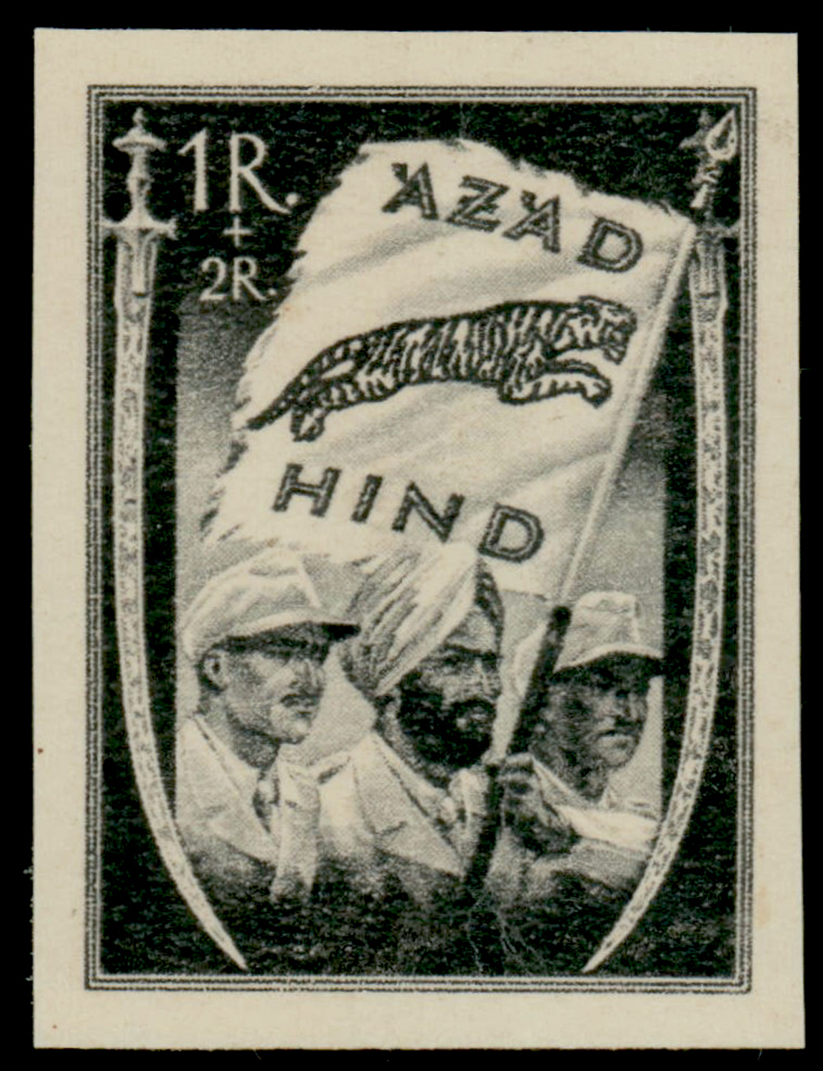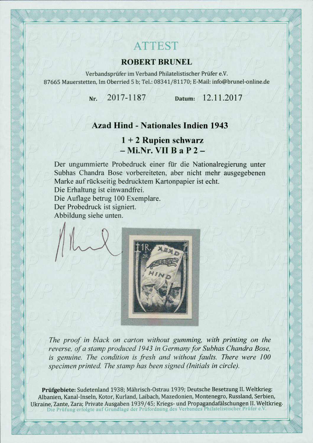 India Azad Hind 1r + 2r proof in black on carton, without gum, with printing on back, as produced in 1943 in Germany for Subhash Chandra Bose. Extremely scarce as only 100 of these were printed. 2017 Brunel certificate