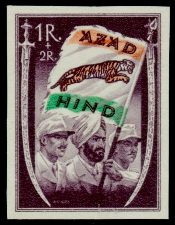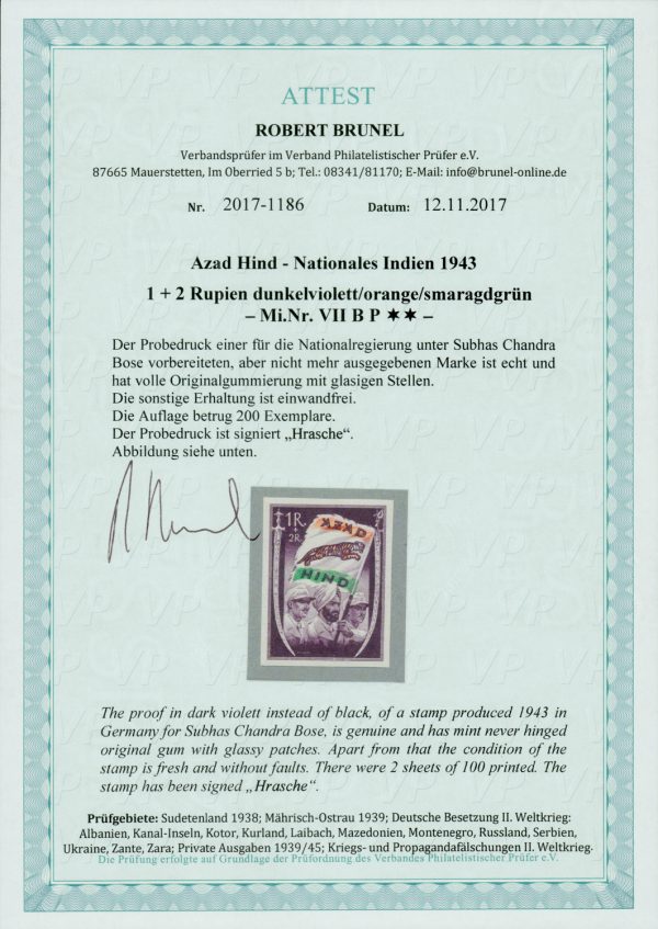 India Azad Hind 1r + 2r proof in dark violet instead of black, as produced in 1943 in Germany for Subhash Chandra Bose, MNH. Extremely scarce as only two sheets of 100 were printed, signed “Hrasche”. 2017 Brunel certificate