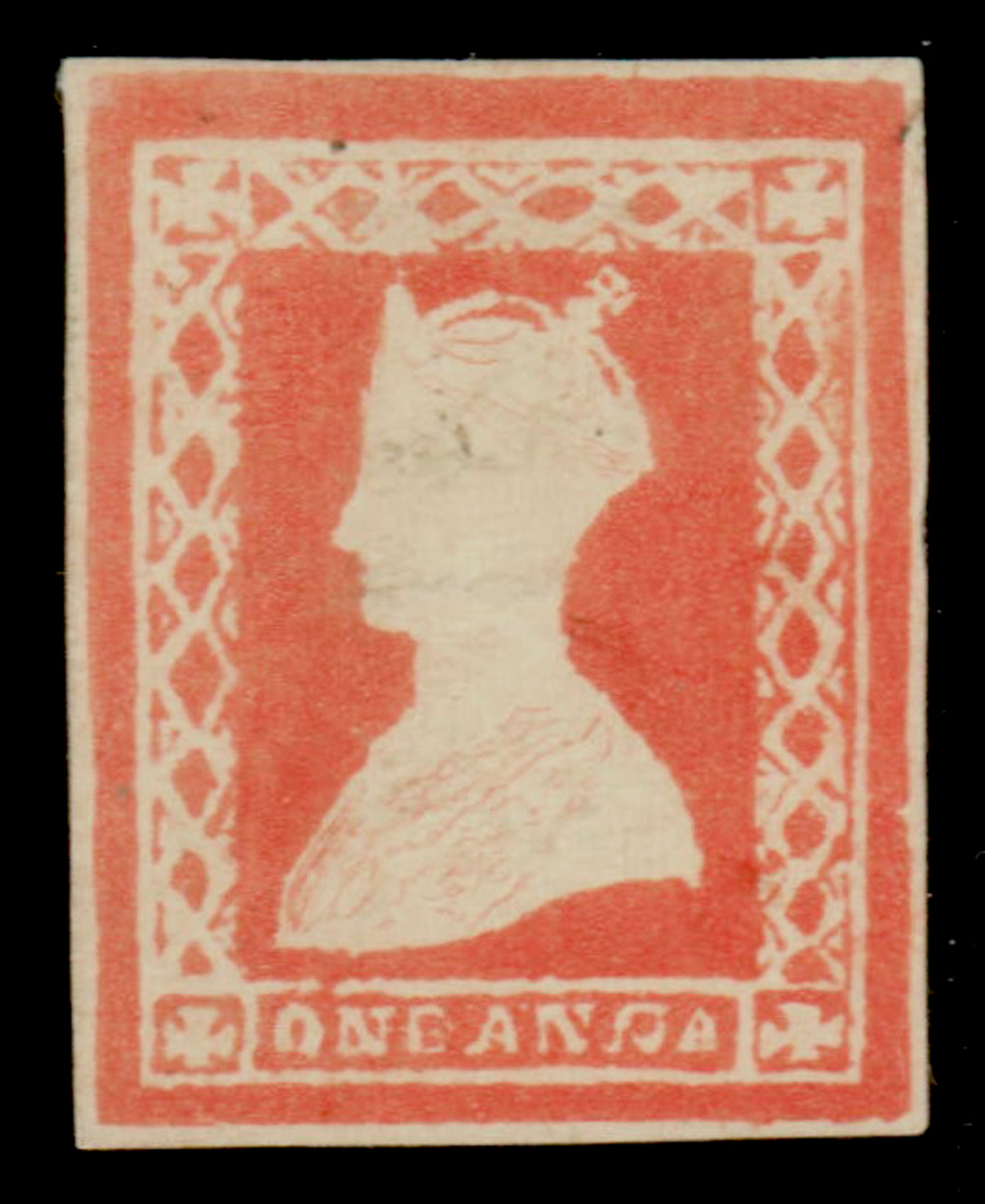 India Essays and Proofs: 1890 photogravure of the 1a Gothic head design essay on yellowish wove paper, taken from impression of the tracing made from the original printed from copper plate in orange vermillion. Spence 10