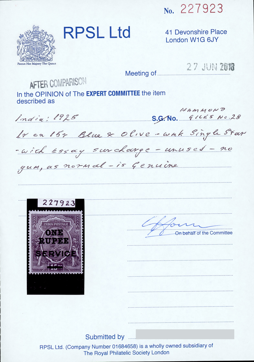 India Essays and Proofs: 1925 “ONE RUPEE” trial provisional surcharge (as Type O14 but in serifed letters, Hammond Giles No.28) in black on 1912-13 GV Official 15r blue & olive, wmk star, without gum as prepared – 2018 RPSL certificate