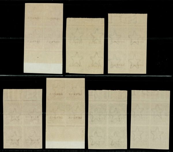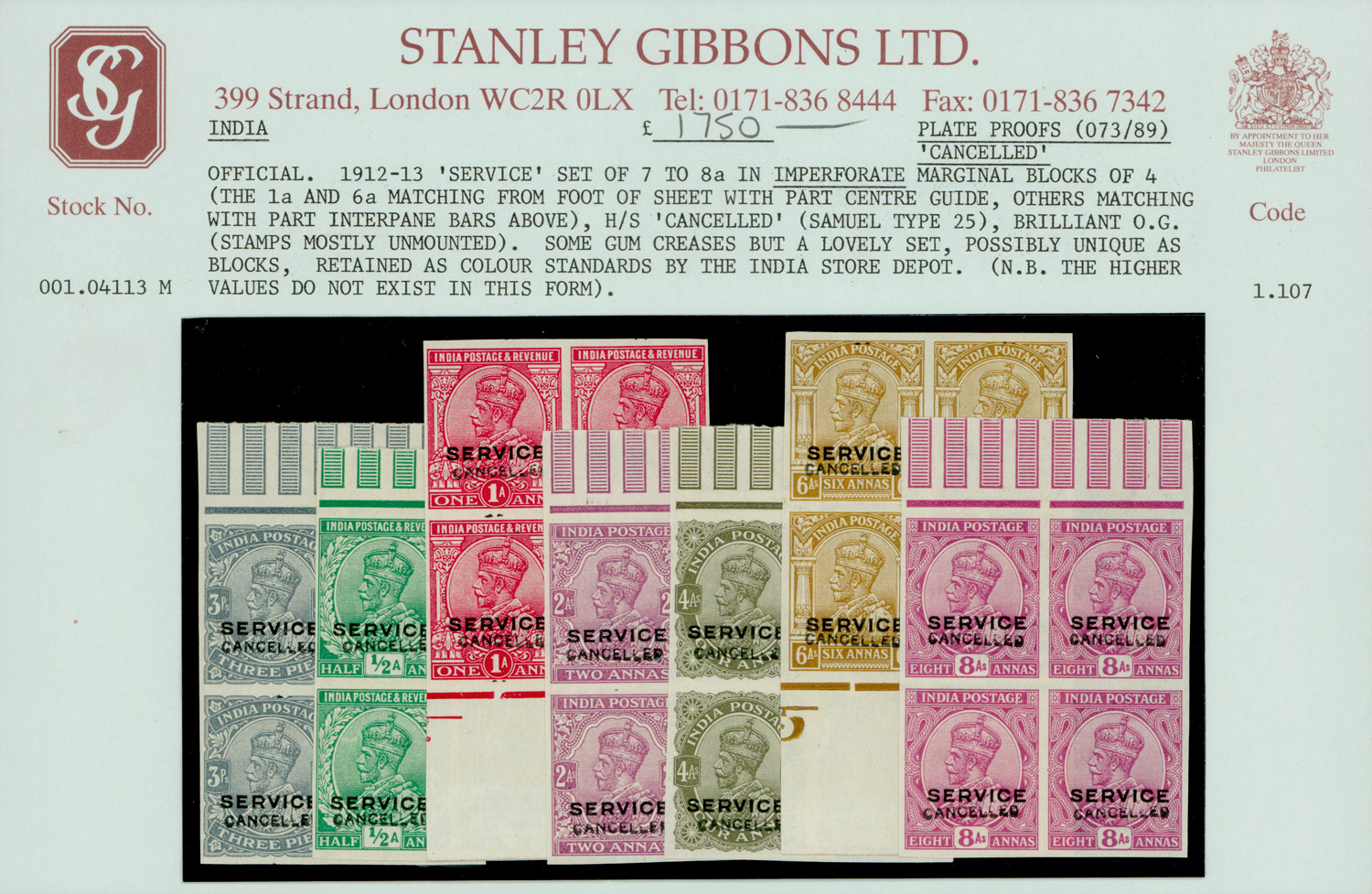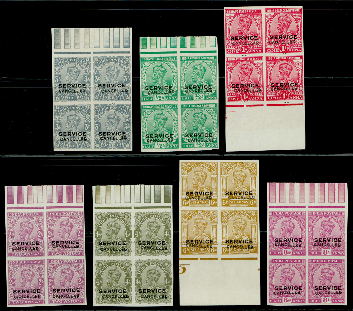 India Imperf Plate proofs of 1912-13 SERVICE set of 7 to 8a in marginal blocks of 4, handstamped CANCELLED (Samuel type 25), mostly MNH, possibly unique as blocks, retained as color standards by the India Store Depot. The higher values do not exist in this form. SG O73/89)