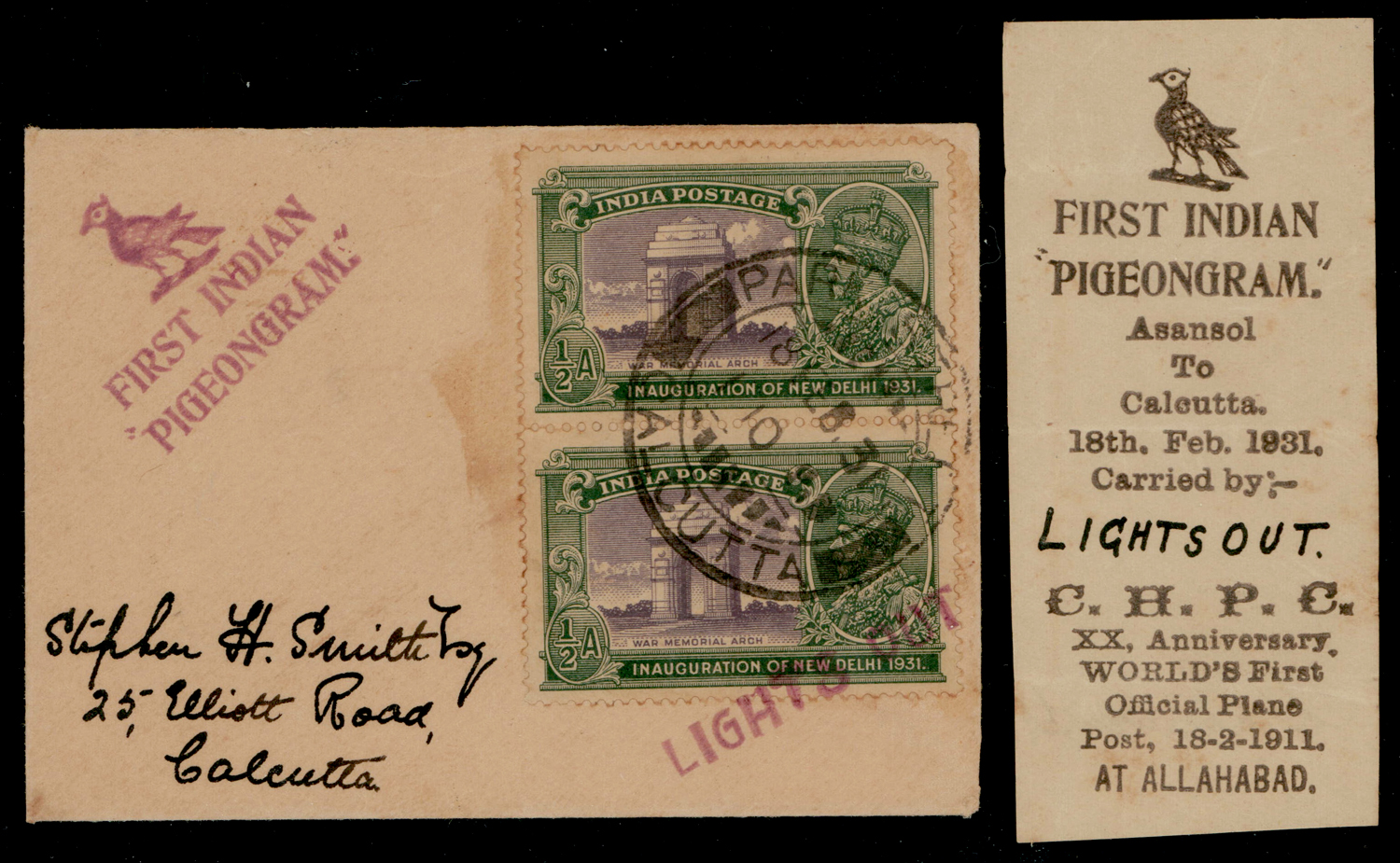 India Pigeongram No.1 – 1931 (18th Feb) Asansol to Calcutta carried by “Lights Out” (including content, signed by Stephen Smith) – 42 homing pigeons carried 2-7 missives each