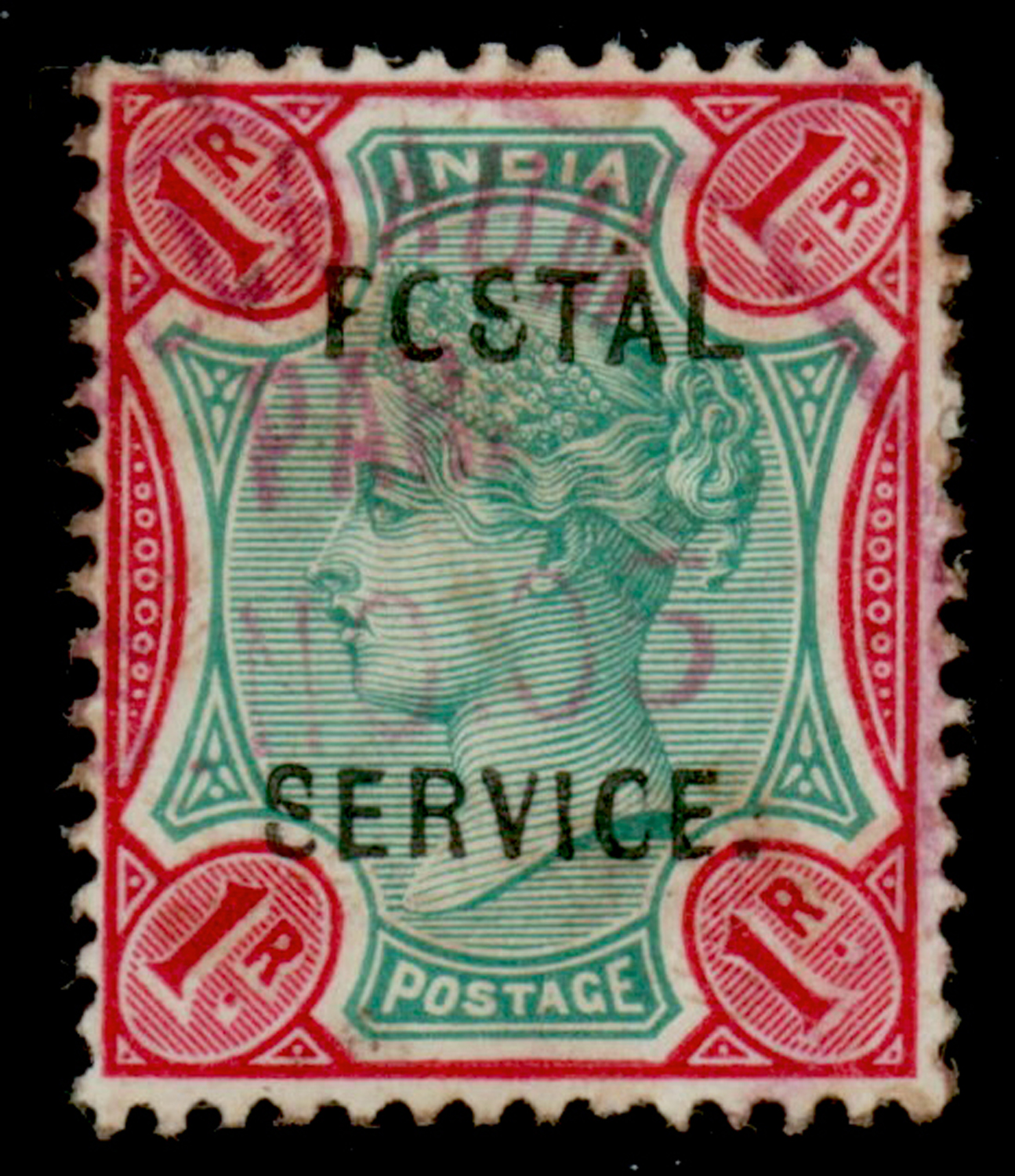 India QV 1r overprinted POSTAL SERVICE, variety: broken letters, used