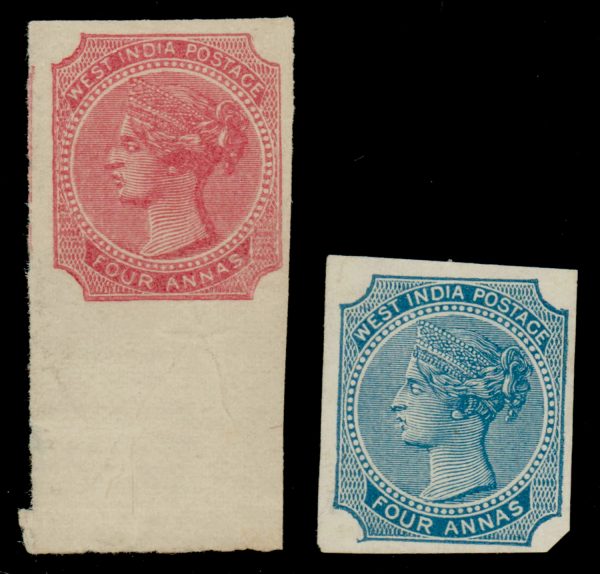 India QV 4a WEST INDIA essay in red, and another in blue, without gum as issued