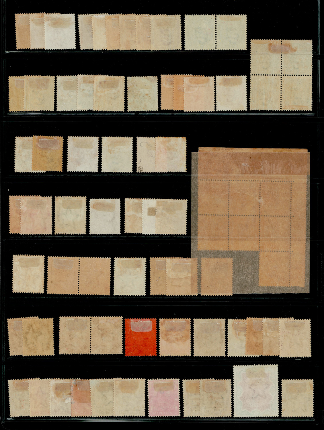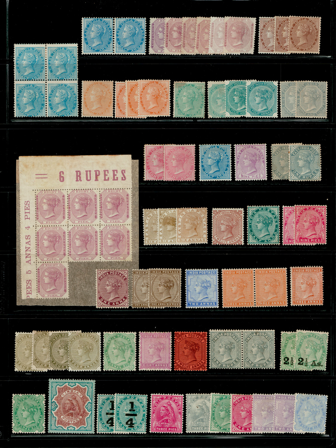 India QV group of mint stamps on a sheet including ½a die I blk/4 and 8p marginal blk/7, mixed condition and several duplicates. Between SG 54/118